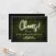Um convite de recepção de casamento com o texto branco néon "Cheers!" sobre um fundo de caixa de madeira com texto e acabamentos brancos.