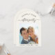 Elegante elopemento em forma de arco ou anúncio de casamento e convite de recepção menores. A frente mostra sua foto do dia do casamento, "Feliz Festa de Sempre" em uma mistura de simples tipografia e roteiro de tendências com sujeiras, seus primeiros nomes e data de casamento ou recepção juntos com um coração. No verso, personalize seu anúncio e convite e adicione seus nomes em um script semelhante a assinatura.