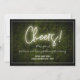 Um convite de recepção de casamento com o texto de neon branco "Cheers!" sobre um fundo de buxinho com texto e acabamentos brancos.