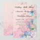 Um convite de casamento elegante com tema floral para recepção pós-casamento. Especificamente para casais que se casaram em um destino de viagem romântico e desejam celebrar com amigos e familiares ao retornarem para casa. O design é uma ilustração em aquarela suave e delicada de um arranjo floral com lindas flores silvestres rosa e azul em um fundo que parece pergaminho pêssego, dando a este design um charme vintage. Flores azuis decoram a borda do design enquanto as flores rosa se desvanecem no fundo para um efeito suave e delicado.