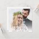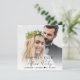 Anúncio moderno de fuga ou convite para pequeno casamento e recepção para informar familiares e amigos que você se casou em uma pequena cerimônia íntima de casamento e convidá-los agora para uma recepção de casamento. A frente apresenta a foto do seu dia de casamento sobreposta com "Festa Feliz para Sempre" em uma mistura de tipografia simples e uma escrita elegante. Abaixo da sua foto, adicione seus primeiros nomes e data do casamento. No verso, você pode personalizar sua mensagem em mais detalhes e adicionar detalhes da festa ou recepção e seus nomes em uma escrita com assinatura.