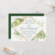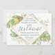 Este convite de recepção de casamento com tema tropical elegante apresenta folhagens exóticas com detalhes em dourado. Uma moldura geométrica moderna dourada destaca o texto verde escuro. Salpicos dourados acentuam o design botânico e trazem um pouco de capricho sofisticado para o convite. Este é o anúncio de casamento e convite de recepção perfeito para qualquer casamento com tema tropical.