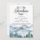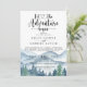 Cena de montanhas e floresta em aquarela rústica elegante para recepção de casamento feliz para sempre, apresentando árvores e montanhas azuis e verdes exuberantes com um texto em letra cursiva: que a aventura comece. Para quem ama um clima romântico e sonhador de floresta para sua cerimônia e celebração. Este convite é para aqueles que tiveram um casamento pequeno e privado e estão organizando uma celebração pós-casamento. Veja a coleção completa de produtos para este design: https://www.zazzle.com/collections/119965625201006103