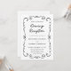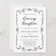 Borda de porta desenhada à mão com código QR RSVP Recepção de casamento preto e branco... Um elegante design de rabisco desenhado à mão borda seu texto de convite em roteiro manuscrito e na tipografia serif tradicional, dando ao cartão uma aparência única para um convite de recepção de casamento noturna. A parte de trás do convite exibe a URL do site do casamento e também um código QR que os participantes podem digitalizar para o RSVP e visualizar todos os detalhes do casamento, incluindo opções de menu. Todo texto, além do script manuscrito, pode ser facilmente revisado com seus próprios detalhes no modelo de personalização.
