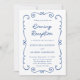 Borda de porta desenhada à mão Elegante com código QR RSVP Cobalt Blue Evening Recepção de casamento Convite... Um elegante design de rabisco desenhado à mão borda seu texto de convite em roteiro manuscrito e na tipografia serif tradicional, dando ao cartão uma aparência única para um convite de recepção de casamento noturna. A parte de trás do convite exibe a URL do site do casamento e também um código QR que os participantes podem digitalizar para o RSVP e visualizar todos os detalhes do casamento, incluindo opções de menu. Todo texto, além do script manuscrito, pode ser facilmente revisado com seus próprios detalhes no modelo de personalização.