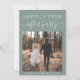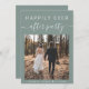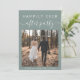O elopemento de chic ou o anúncio de casamento privado e o convite de recepção com sua foto, "Felizmente Nunca Depois da Festa" em uma mistura de simples letras brancas e roteiros de tendências com balas, e seus primeiros nomes e data de casamento se juntaram com um coração. No verso, personalize seus detalhes de recepção e adicione seus nomes em um script semelhante a assinatura.