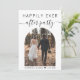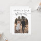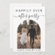 Elemento moderno ou pequeno anúncio de casamento e recepção/convite de festas. A frente apresenta sua foto em uma trendy arch inspirada em vassoura e "Felizmente, nunca depois da festa" em uma simples tipografia e um roteiro de na moda com baloiços. Adicione seus primeiros nomes e data de casamento ou recepção. No verso, personalize seus detalhes e adicione seus nomes em um script semelhante a assinatura.