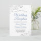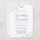 Os convites de casamento são projetados para convidados que são convidados apenas para a recepção, mas não para a cerimônia propriamente dita. Eles apresentam um design simples, mas elegante, com babados de renda prateada em falso foil sobre um fundo branco. O texto alterna entre cinza e azul poeirento com um verso colorido em azul-cinza marmorizado.