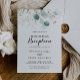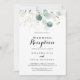 Este convite de recepção de casamento floral ouro com eucalipto rústico é perfeito para uma festa simples após o casamento. Este design artístico apresenta flores douradas desenhadas à mão e folhagem verde de eucalipto em aquarela, inspirando beleza natural.