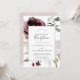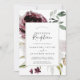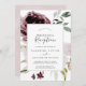 Este convite de recepção de casamento floral romance é perfeito para uma festa elegante após a fuga romântica. O design moderno rústico boho apresenta flores românticas em aquarela em tons suaves de borgonha, mauve, rosa beije e branco creme com folhas verdes. Cartões de RSVP são vendidos separadamente, ou você pode adicionar informações de RSVP no verso do cartão.