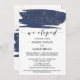 Este convite de recepção de casamento furtivo em aquarela azul marinho e dourado é perfeito para uma festa de casamento furtivo elegante. Este design abstrato de noite estrelada apresenta um pincel dramático de aquarela azul marinho sobreposto com belo brilho dourado falso. Os cartões de RSVP são vendidos separadamente.