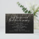 Recepção de Casamento | Recepção Moderna Abstrata de Casamento Depois da Festa - Champanhe ousada e arrojada em uma grinalda preta brilhante cascata pela página, em caligrafia manuscrita é "comida bebida e movimentos de dança ruins" - o resto do texto é simples e limpo - tudo em um fundo preto. Papelaria de casamento casual divertida e ousada.