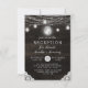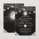 Oak Ridge Rústico Barn Madeira Marrom Escuro, Jarras de Mason Brilhantes e Design de Luzes de Corda Brilhantes com fios cintilantes de luzes penduradas e jarras em uma textura de madeira rica e profunda com acentos de renda branca. Com fontes de tipografia moderna em script. Um design de estilo rústico e elegante de casa de campo country - Convite de Recepção de Casamento Personalizado!