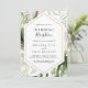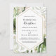 Este convite de recepção de casamento tropical geométrico dourado é perfeito para uma festa moderna pós-fuga. O design apresenta folhas de palmeira e banana douradas e verdes pintadas à mão com flores cor-de-rosa agrupadas em buquês, adornando uma moldura geométrica.