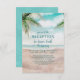 Cena de Praia Pintada Ilha Brisa, com Ondas do Oceano, Praia Arenosa e Palmeiras, com um Céu Azul Teal Lindo. Com Fontes de Letra de Tipografia Moderna. Uma Praia Tropical de Verão, Ou design de casamento de destino - Convite de Recepção de Casamento Personalizado!