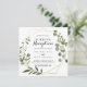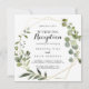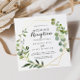 Este convite de recepção de casamento tropical verde geométrico dourado é perfeito para uma festa simples após a fuga romântica. O design apresenta belas folhas verdes pintadas à mão, adornando uma moldura geométrica dourada.