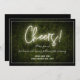 Um convite recepção de casamento com o texto branco de néon "Cheers!" sobre um fundo de madeira de boxe com texto branco e acabamento.