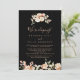 Este cartão de recepção de elopemento floral real e formal preto é perfeito para um moderno partido de elopemento poste. A design apresenta cor-de-água rosa, pincel e flores brancas elegantes com folhas esmeraldas verdes.
