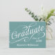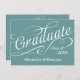 Plano de fundo azul com texto branco suave com "formando" e um ano personalizado, excelente para o formando anunciar a grande conquista. Celebre no verso com texto de evento de recepção personalizado para seus convidados. Todos os Designs Copyright © www.CustomInvitesOnline.com