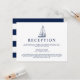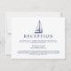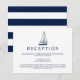Convites de recepção temática náutica com um veleiro estilo vintage e um fundo listrado de azul-marinho e branco no verso.