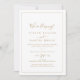 Este convite de recepção de fuga minimalista em ouro é perfeito para uma festa simples após a fuga. O design romântico moderno apresenta tipografia clássica em ouro e branco, combinada com uma caligrafia rústica, porém elegante, com estilo de letra à mão vintage. Personalizável em qualquer cor. Mantenha o design simples e elegante, como está, ou personalize-o adicionando seus próprios gráficos e ilustrações. Cartões de RSVP são vendidos separadamente, ou você pode adicionar informações de RSVP no verso do cartão.