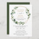 Este convite de casamento elegante e personalizável apresenta uma moldura geométrica dourada adornada com belas folhagens de verde aquarela e foi combinada com uma caligrafia caprichosa e uma fonte serif elegante em dourado e cinza. Para fazer alterações avançadas, selecione a opção "Clique para personalizar ainda mais" em Personalizar este modelo.