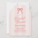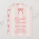 This coquette bridal shower invitation features a red bow on a cream background with light pink stripes. The reverse side features a cream background with a red bow pattern. Personalize it for your needs. You can find matching products at my store.