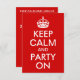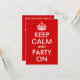 Áreas de texto personalizáveis em uma paródia vermelha e branca "Manter calma e festa ligada" para uma festa de aniversário.
