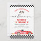 Este adorável convite apresenta um carro de corrida de cor vermelha com detalhes de chama.