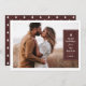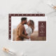This rustic Christmas card features a large photo with a white border frame. On the right side of the card, there is a red, vintage-inspired label with the holiday greeting and space for the customer's name. There is a small pine tree illustration on top of the label, as well as a subtle woodgrain texture in the background. The back of the card features a coordinating, all over pine tree pattern.