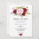 Este doce tropical vermelho de dezesseis convites de aniversário é perfeito para uma elegante comemoração de 16 anos. O design de marsala artístico bordo apresenta rosas de aquarela, verdes, cor-de-rosa, burgundy e blush, combinados com verde, bem arrumados num buquê de flores gracioso e radiante.