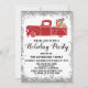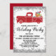 Celebre a época de férias com este caminhão festivo de vintage vermelho com presentes no Natal. Os detalhes do partido são escritos em uma tipografia branca e esbranquiçada de escrita negra, com uma luz cintilante prateada brilha na borda e fundo branco. Este convite é perfeito para uma festa de Natal/ Natal/ inverno!