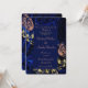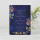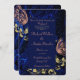 Este maravilhoso convite à volta do casamento em ouro vibrante e azul real com delicadas espirais de ouro e borboletas cor-de-rosa brilhantes adiciona um encanto elegante ao seu evento.
