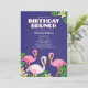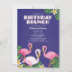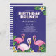 Cor-de-rosa, branco e flamingos das bolinhas com folhas do monstera e flores do plumeria. Este olhar tropical no roxo rico com as listras na parte traseira é perfeito para sua refeição matinal temático do aniversário.
