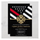 Este design apresenta uma bandeira de bombeiros com listras pretas e brancas, e também uma faixa fina vermelha. "Parabéns" e um distintivo de bombeiro ficam acima de todos os detalhes da festa para a aposentadoria do bombeiro, tenente ou chefe reformado. Os convites também podem ser personalizados para um graduado da academia de bombeiros.