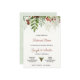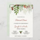 "Rehearsal dinner invitation with floral design. The front features elegant green and red leaves at the top, with event details in script fonts. The back is plain."