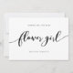Elegante cartão "Você Será Minha Dama de Flores" apresentando a palavra "flor" em uma fonte cursiva relaxada preta contra um fundo branco. O cartão tem um verso preto com linhas brancas sobrepostas.