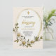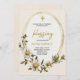 Religious invitation card with floral design. Features a gold cross and circle framing text about a blessing event. White flowers and green leaves accent the elegant off-white background."
