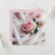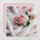 Uma rosa-rosa suave está delicadamente sobre o tecido de tula branca, fluindo, criando uma atmosfera elegante e romântica para um casamento ou firmação de votos de casamento. Todo texto é editável.