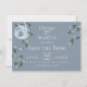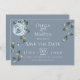 RESERVE A DATA | rosas de cor azul empoeirada, com vegetação úmida, com fundo azul empoeirado, com texto branco. O reverso é um azul empoeirado complementar. Personalizar texto, estilo de fonte, cor e tamanho. Arte original criada para o BarefootBride™ por © WhimsicalArtwork™ - Esta é parte de um Conjunto completo de Artes de Casamento, chá de fraldas e outros artigos de papelaria para eventos semelhantes.