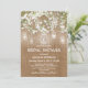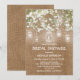 Convites rústicos para festa de casamento no campo com luzes cintilantes, apresentando um efeito de lona marrom rústica, luzes de corda em jarro de mason elegantes, flores de respiro de bebê e um modelo moderno para a festa de casamento.