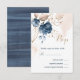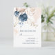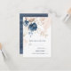 Cartão postal de resposta de casamento elegante com ilustração de flores azul marinho e dourado em aquarela com respingos de pêssego claro.