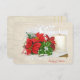 Buquê de poinsettia e alianças com vela e Bíblia em moldura de máscara elegante para resposta de casamento de Natal.