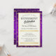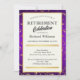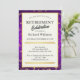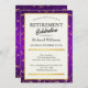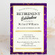 Faça uma grande declaração com o nosso Convite de festas de Reforma Formal Elegante! A "Celebração de Aposentadoria" do painel central, fora do branco, é elegantemente criada em uma combinação de fontes serif e script, adornada com ornamentos intrincados, fornece um quadro sofisticado para seus detalhes personalizáveis, incluindo nome, data, endereço e RSVP. Coloca-se contra um padrão roxo e dourado. Projetado para organizadores de família e corporação.
