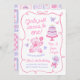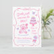 Um convite de aniversário de uma garota balbuciana em uma estética de coquete rosa suave. Esta design única desenhada por mão apresenta um ursinho de pelúcia, bolo, arcos e borboletas para um tema de festa feminino e pastel. Perfeito para garotas de qualquer idade.