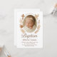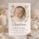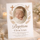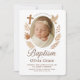 Este elegante design de batismo apresenta um retrato de um bebê dormindo enquadrado por elementos botânicos boho suaves em tons quentes de bege e taupe. Uma pomba, cruz e delicados ramos folhosos criam uma aparência espiritual pacífica que parece atemporal e suave. A tipografia clássica e serifada adiciona um toque refinado, mantendo o layout quente e convidativo. É uma escolha linda para famílias que amam designs minimalistas inspirados na fé com uma paleta de cores neutras suaves.