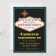 Este convite de festas personalizado apresenta um tema retrô de Las Vegas sobre um fundo negro. O clássico sinal de "Bem-vindo a Las Vegas" está impresso no centro. Você pode personalizar o texto no sinal para incluir as informações do seu próprio partido. Uma borda azul neon enquadra o convite. O texto abaixo é impresso em uma fonte amarela neon.