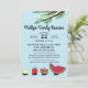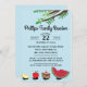Engraçada reunião familiar com formigas carregando comida de piquenique incluindo melancia e bolo e campos de texto personalizáveis para suas informações de reunião de família.
