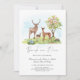 Um primavera e um verão com o tema Baby Gender Reveal convite de festas. O design de aquarela apresenta uma família de veados com uma proa parada em uma cena de floresta floral com flores azuis e cor-de-rosa. O texto da tipografia negra diz "buck" ou "doe"?