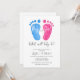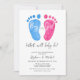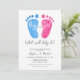 Estes convites à apresentação de gênero giro são decorados com pés de bebê cor-de-água rosa e azul. Dizem "Menino ou Rapariga, O que será o bebê?" na tipografia de na moda. Facilmente personalizável. A trabalho de arte é de Michele Davies e é exclusivamente vendida através do Zazzle. Original Watercolor © Michele Davies.